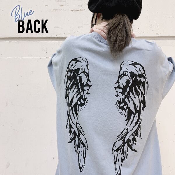 バックプリントの天使の羽根がインパクト抜群のTワンピ、コットン100%天竺素材で着心地が良く使いやすいおすすめの1枚です。ゆったりとしたシルエットが体のラインを拾わず華奢見え効果も★